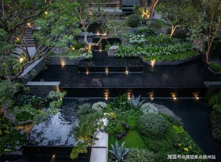 叠级水瀑:随形就势,流水从近7米的跌水台层层落下,撞击在幻影蓝奢石打造的台面与蓝金刚池底上,发出清脆的潺潺声,搭配高低错落的绿植,从视觉、感觉、听觉多维感知林间绿意。