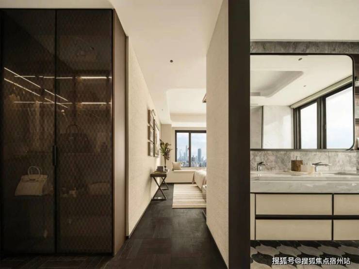 主卧 步入式6扇门衣帽间,采用 艺术玻璃夹丝柜门, 回型纹拼花的地板,处处是低调又高调的质感。