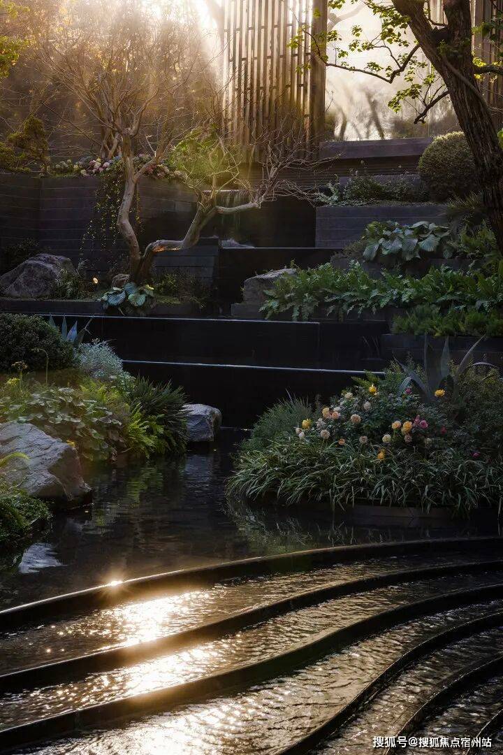 林涧溪谷:以300㎡镜面水为核心,周围环绕叠级景观,水面如镜子般倒映着天空、绿植与石材,分不清哪里是实景,哪里是倒影。