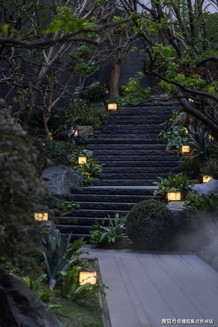 拾阶山林:安哥拉黑奢石铺设的步道,拾级而上,时而穿梭于绿植之间,时而驻足欣赏景观。