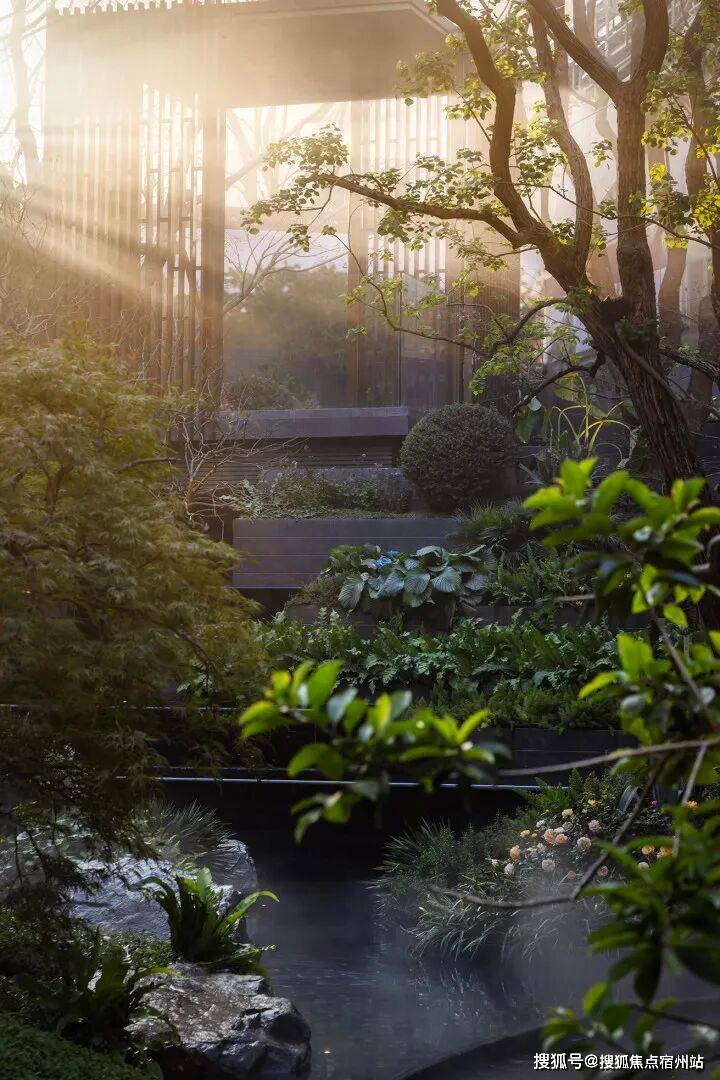 金茂用约7米高差打造纵向立体生态景观,原石的沉稳、植被的鲜活与水流的灵动相互交织。