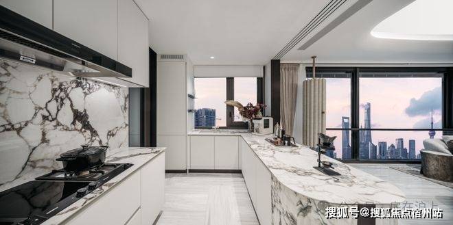 约270°环幕大边厅尺度感十足!高区直面陆家嘴城市天际线+黄浦江景观,视野相当震撼!中厨+西厨岛台、客餐厅+阳台面积近约53㎡,不失为一个超棒的家庭休闲空间!