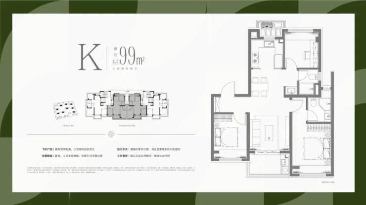 实现了大面宽横厅的飞机户型设计,使得南向的开间,全部布置为客厅、主卧和次卧三个最重要的功能区;北向房间则布置了次要的厨房、次卫、书房和主卫功能,最优化的提供南向面宽和缩窄户型整体进深,提升户型整体的采光和通风。