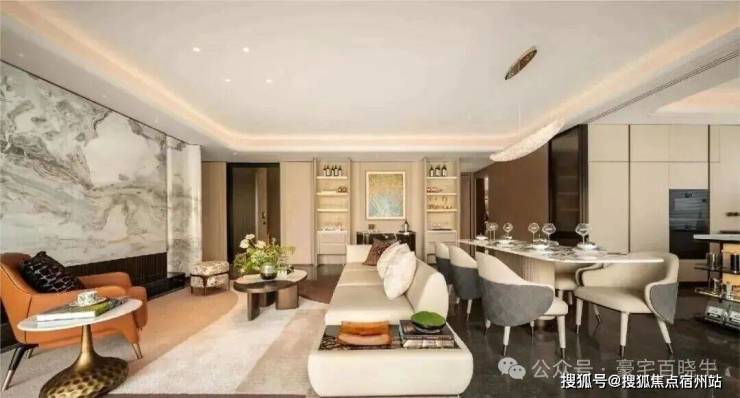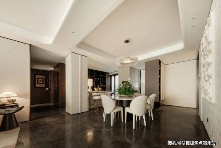 餐厅区域打造了整面墙的 餐边柜(交付标准),中间是弧形的 芬迪白奢石背景墙,工艺复杂,视觉效果非常震撼