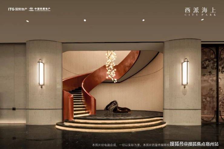 繁花之梯:同频百年华尔道夫,以精工细节打造海派艺术空间,一抹红色艺术楼梯是会所中的点金之笔,其形态宛若一缕红飘带,点缀于会所当中。