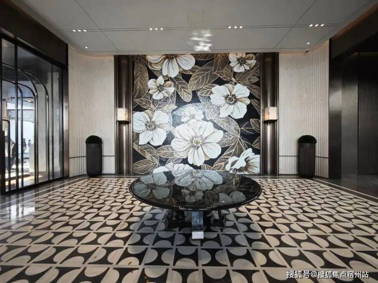 接待大堂采用全手工拼贴的“繁花”马赛克背景墙,地面是海派拼花地砖,奢贵沉稳又不失华丽质感;