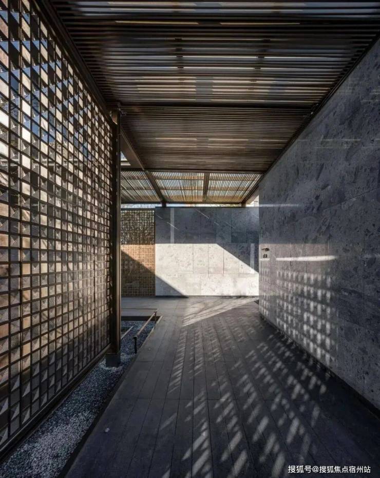 厅堂和轩堂,也在这番赏景过程中,毫不突兀地依次出现。前者还原出孔子树下讲学的场景,后者则用金属编织的卷帘搭配青绿色彩釉玻璃,构建出一个品茗厅琴的空间。这一切来得如此自然、连贯,富有节奏和层次,把园林艺术的本质抓得入木三分。