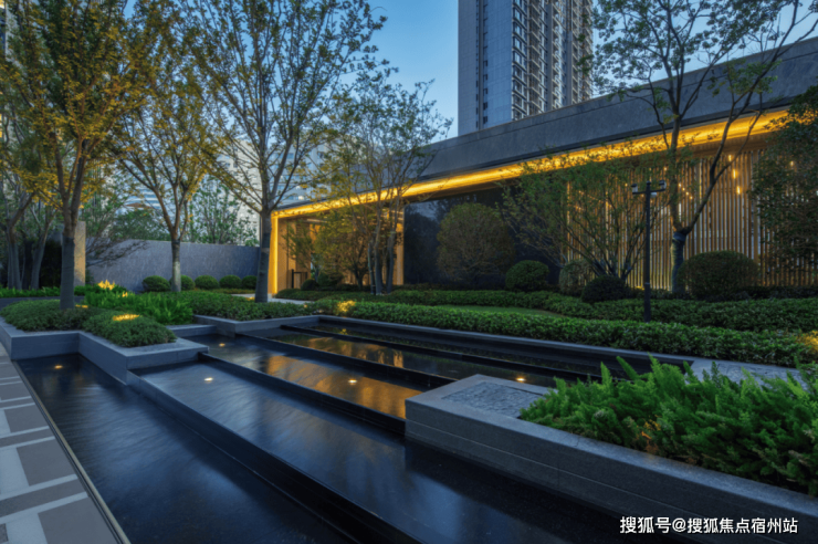 景观营造以百年黑松、朴树与红枫构成季相丰富的林木序列,融合灵动水景,形成步移景异的自然体验。在这样一个精炼的社区尺度内,入口处竟巧妙排布了三处有意境的水景。