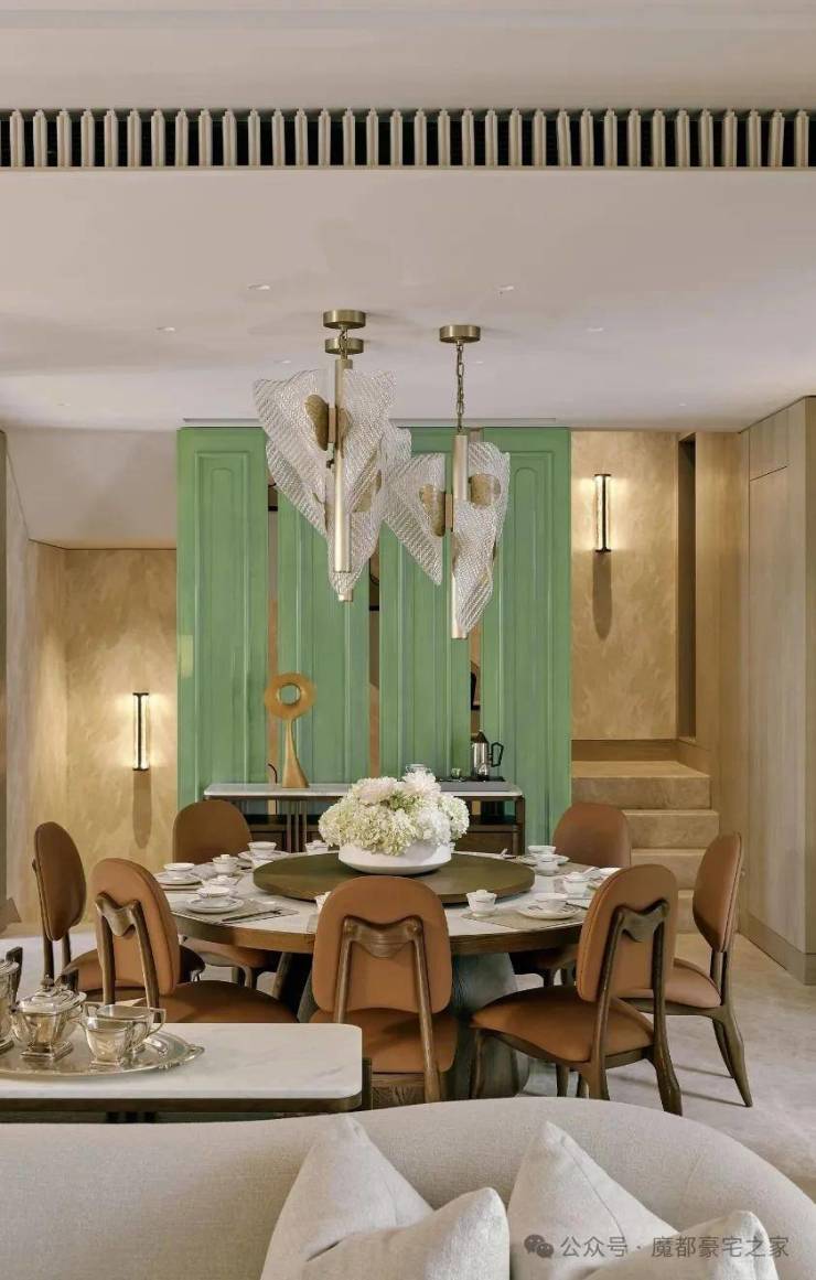 顶层下午茶区以淡绿为底,壁炉暖光漫过手绘地毯的肌理,将社交场域沉淀为冥想容器;主人房墙面缟玛瑙(Onyx)的天然流痕,也与一层屏风暗纹形成时空对位,光影在矿物晶体中生长出私密的诗。☑️☑️华润士林润园售楼处电话:400-1183-605☑️☑️