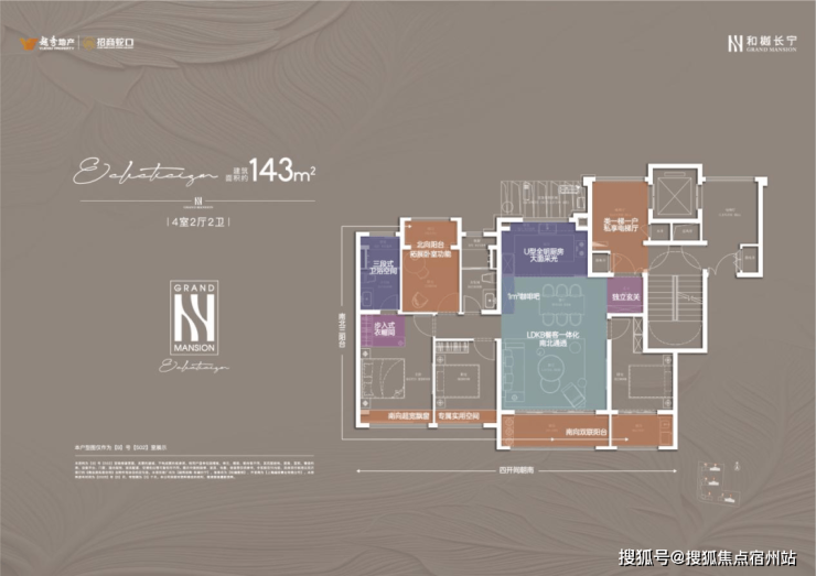 建面约143㎡的4房户型, 类一梯一户的设计,每一户都有一个面积约8㎡的独立采光电梯厅空间;四开间朝南+大宽厅,采光效果爆棚;通过LDKB一体化设计,形成一个近50㎡的客餐厅空间,极大提升空间场景的可能性;卧室也采用了酒店化套房设计,主卧贯穿南北套房设计,南北皆有飘窗。