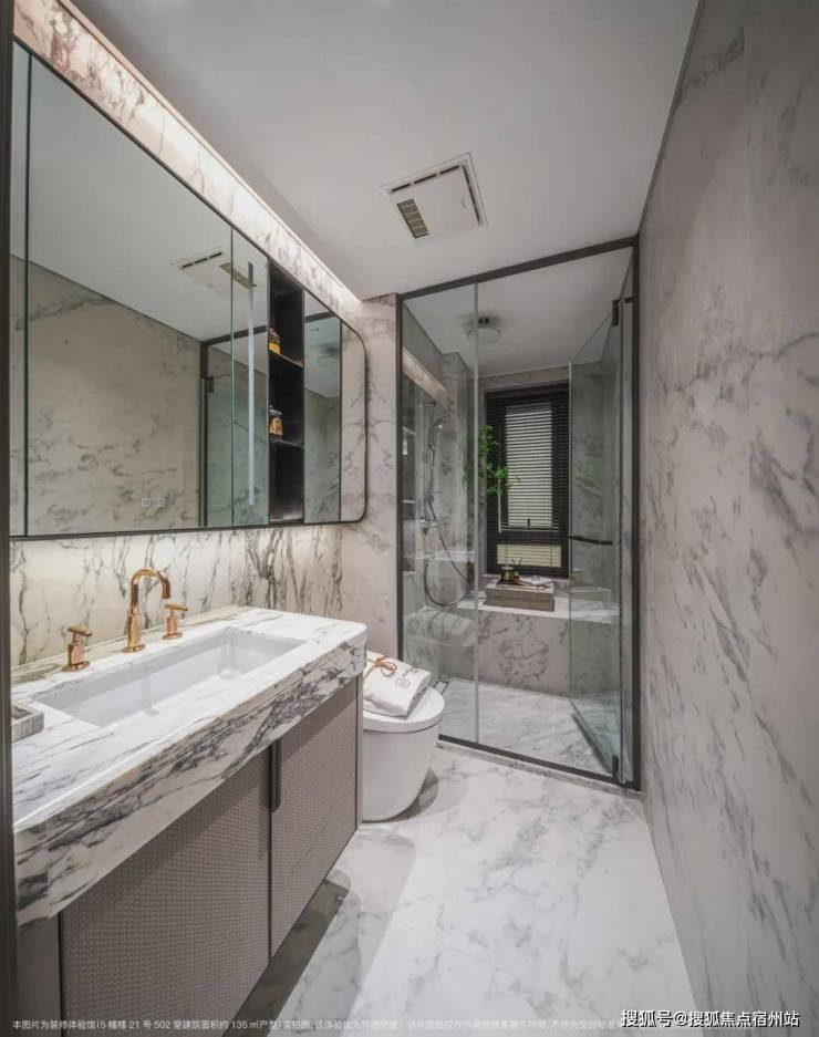 卫生间墙面采用大面积岩板,台盆柜处定制镀金龙头;另外超大镜面柜内配置了充电口,方便剃须刀、电动牙刷等工具收纳。☑️☑️招商臻境售楼处电话:400-1183-605☑️☑️