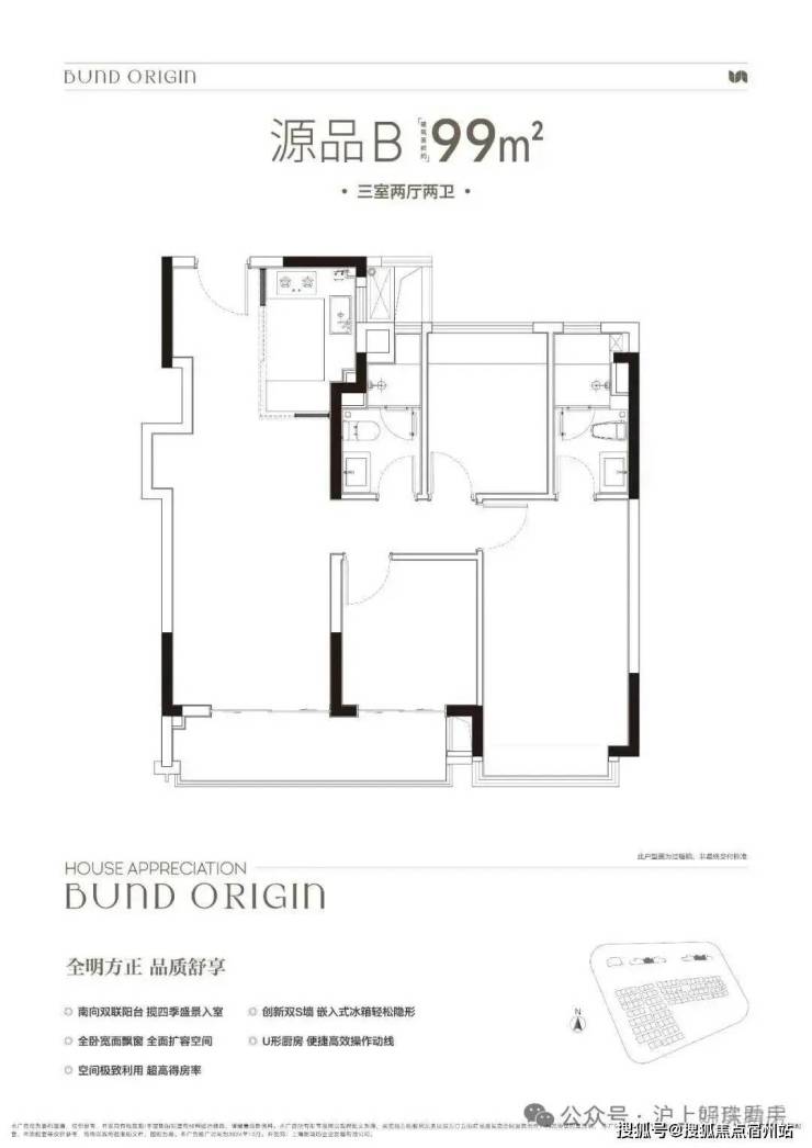 建面约99㎡3房2厅2卫,非常标准的动静分离、三开间朝南户型。