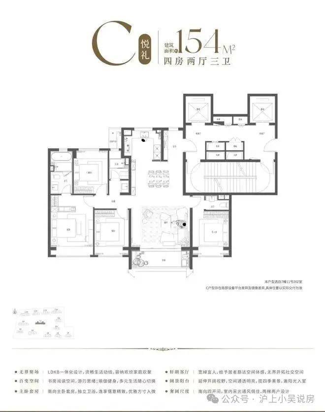 4房2厅3卫设计,整体格局方正,南北通透,四开间 超14米奢阔尺度,阳光清风肆意流淌。约9.9米阔绰LDKB一体化空间,大尺度的竖厅设计,容纳多元家庭欢欣团聚。