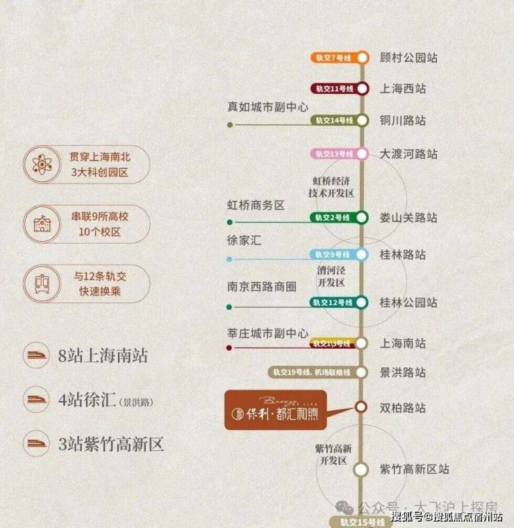 经15号线,向南可至紫竹高新区、交通大学、华东师范大学所在的大零号湾;向北快速通达华泾、南站、漕河泾及古北等重要节点。