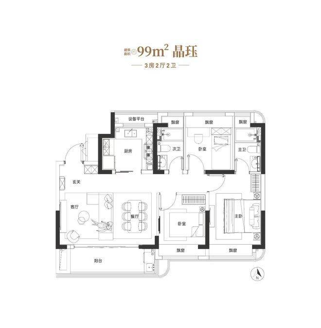 建面约91㎡做3房2卫,三开间朝南、3房5飘窗1阳台,整体室内的采光、视野以及通风都相当出彩。动静分离+主卧套房的设计,保证了整体居住的安静和私密性。