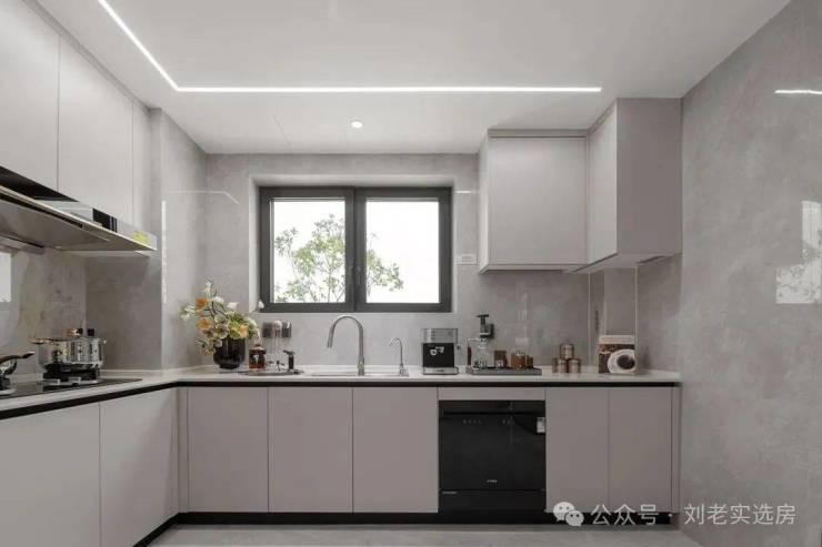 U 型开敞厨房,符合洗、切、炒、顾烹任流程,高厨房利用率。预留冰箱尺寸。
