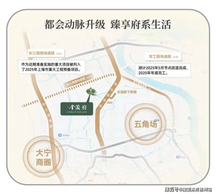 在城市交通路网方面,江湾金茂府同样优势显著。周边拥享中环高架、长江西路快速路、外环高速三横主轴,以及逸仙路高架、南北高架两纵接驳 。