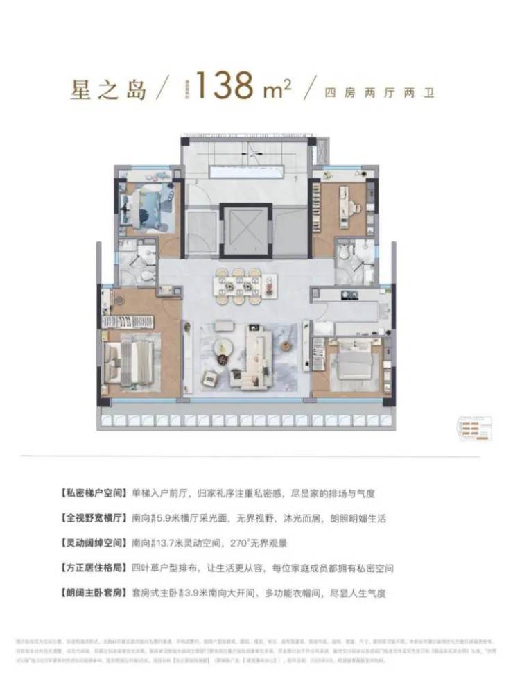 这个四房虽然建面只有138㎡,但因为是5层叠墅的高得房率,以及室内空间的高效利用,其功能和尺度感,给人的感觉十分惊艳。