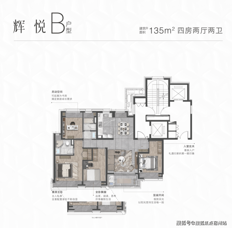 约135㎡户型,是对“平等与成长”的作答。通过LDKB一体宽厅、创新S墙设计及平均扩大约20%的卧室空间,让每位成员的舒适与尊严都被悉心呵护,为家庭的持续生长预留了充足的弹性。