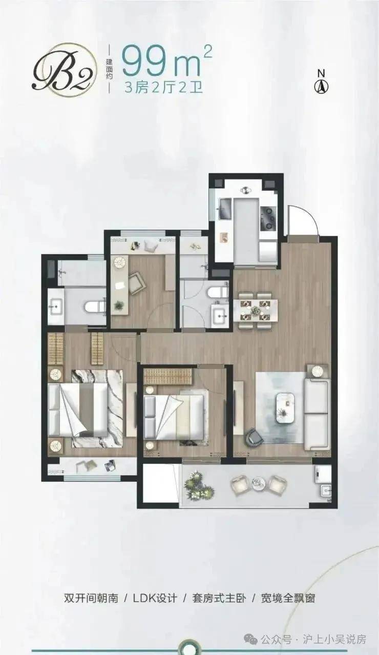 建面约99㎡3房,双开间朝南,双联观景阳台,具有良好的采光、通风。LDK设计,增强互动交流。套房式主卧,步入式衣帽间,兼具舒适性和私密性。