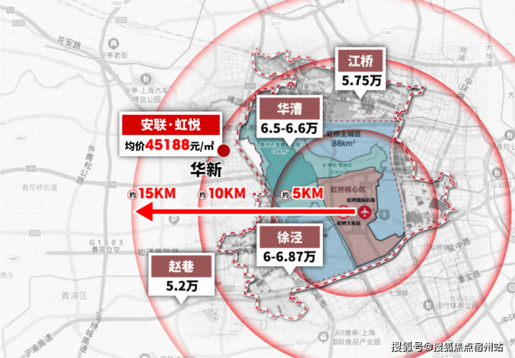 以虹桥火车站为圆点,10公里为半径,几乎所有板块新房价格都逼近甚至超过6万/㎡,4字头的华新甚至比二线辐射板块赵巷还要实惠!