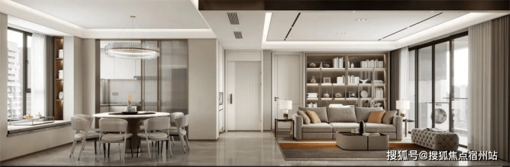 细节更值得点赞!客厅和主卧都标配悬浮吊顶、无主灯设计,背景墙采用皮革和铝合金拼接,也都是实体交付的。厨房拉门采用上轨道设计,地面没有卡槽方便清洗,而这扇门也采用金属镶边,提升质感。甚至就连踢脚线这种容易被忽视的部位,都使用了窄边铝合金,真的诚意满满。