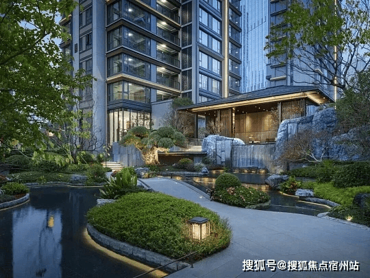 一进府门:恢弘新中式门头,飞檐翘角、石材立面,搭配潺潺水景,彰显世家礼仪与归家仪式感;