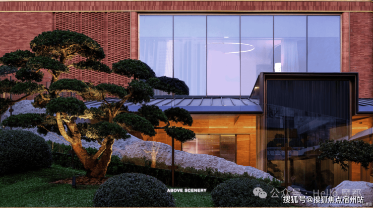 山水庭院汲取《足立美术馆》的造境手法,以老石皮、百年古木原样搬运,重现山间岁月的自然痕迹,与庭院中的光影交织,仿佛将山间的自然采光与静谧之感搬入城市。阳光透过树梢洒落,石皮上的纹理在光影中若隐若现,宛如一幅流动的自然山水画卷。