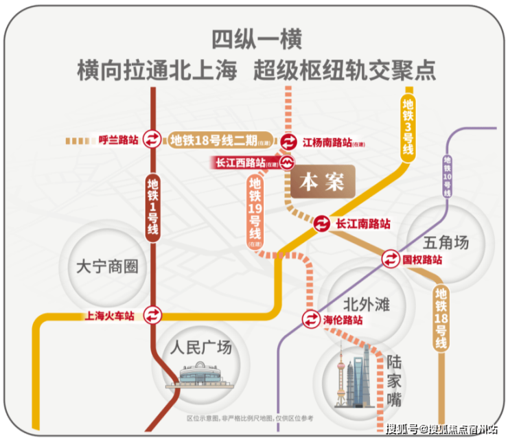 项目紧邻长江西路地铁站(在建),直线距离仅200米(北门至地铁站)地铁18号线横向拉通了原本纵向不相连的四线地铁(1/3/18/19),将北上海横向联通,成为区域轨交的交汇聚点。1站江杨南路,5站复旦,7站五角场,让您快速抵达城市的各个核心区域,畅享便捷的都市生活。