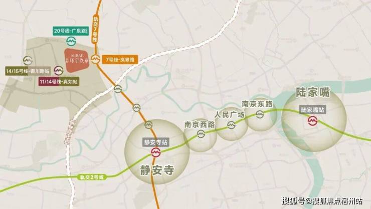 五轨交汇:7、11、14、15、20号线(在建中),4站静安寺,5站中山公园、7站人民广场,半小时内覆盖上海核心商圈