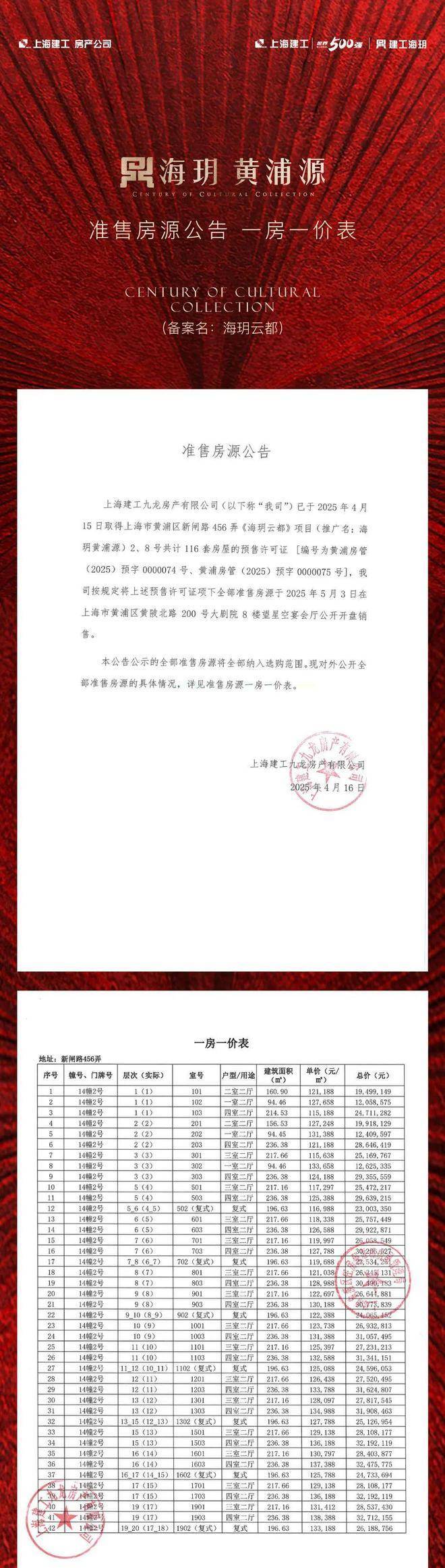 黄浦区「海玥黄浦源」少量建面约193-402㎡多种户型;均价14.56万/㎡!