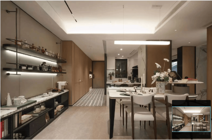 其中,餐厨系统的进阶不只在于橱柜、拉蓝等细节的收纳,更在于映江润府引入创新的S墙,可以轻松将冰箱移出厨房,同时保证视觉效果的整体性。