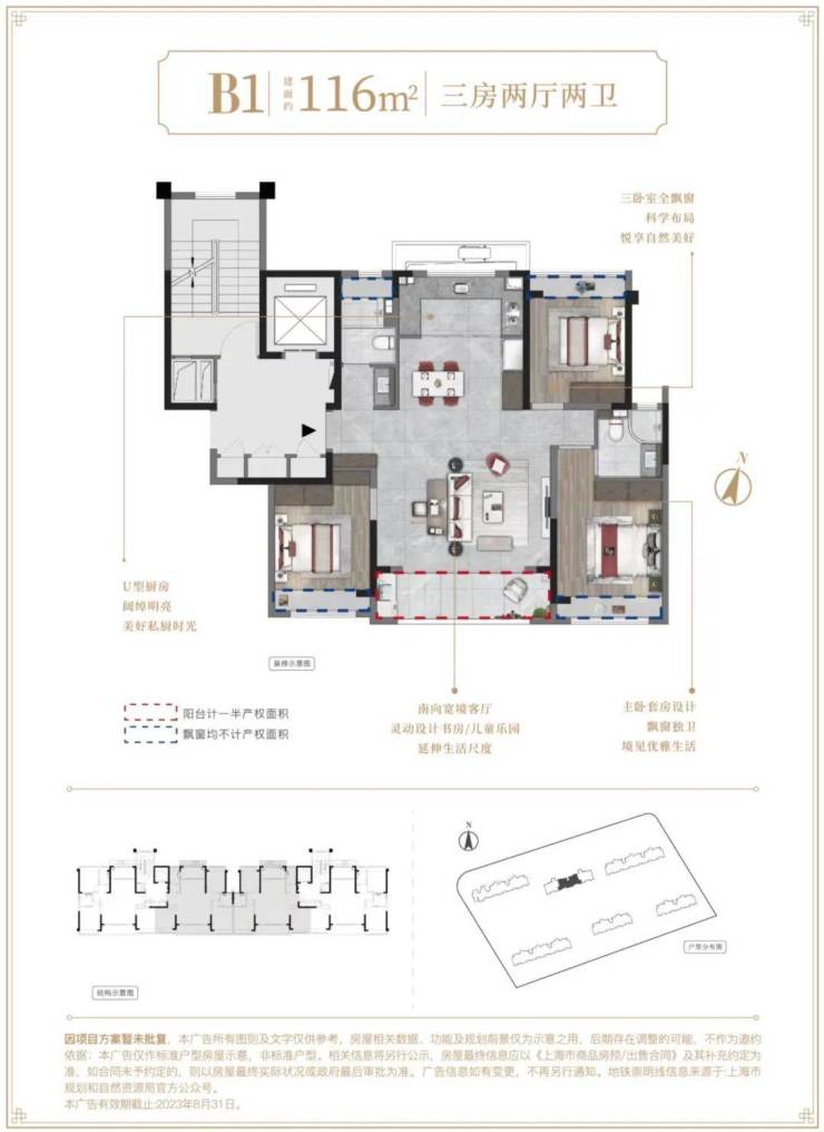 116m²户型特点:三卧室全飘窗,科学布局,悦享自然美好,南向宽境客厅,灵动设计书房/儿童乐园,延伸生活尺度,U型厨房,阔绰明亮,美好私厨时光,主卧套房设计,飘窗独卫,境见优雅生活。