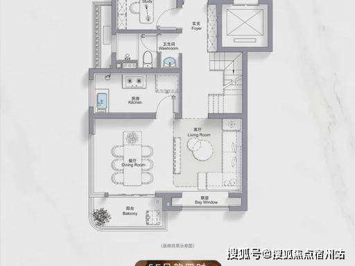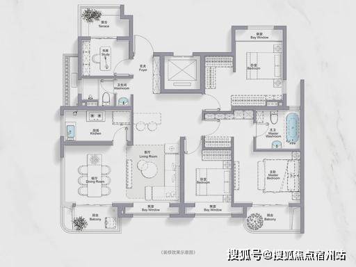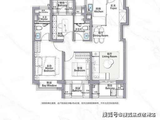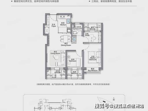 105㎡三房两厅两卫:创新 “三阳台” 设计,客厅、次卧、主卧各连阳台;主卧套房设计,带独立卫浴与衣帽间;客卫干湿分离,三口之家舒适之选。
