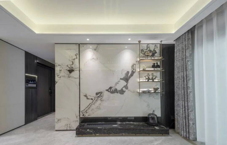 金茂定制壁布/墙纸:结合芬迪白岩板打造的客厅背景墙,营造独特的归家氛围。