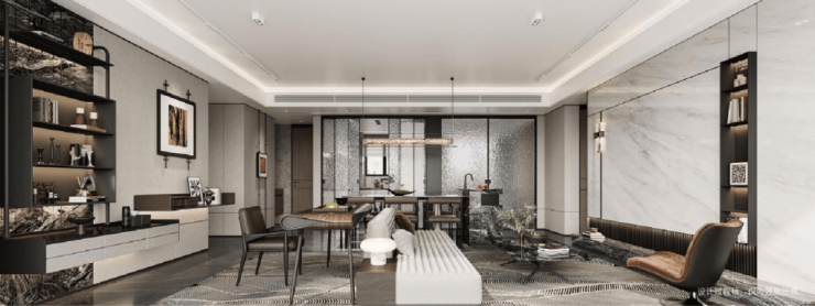 售楼处设计源自伦敦与上海半岛酒店的优雅复古,将现代极简主义美学运用到极致。沙盘区景墙将取材Celine御用石材宝格丽黑大理石,以永不过时的摩登气息,点睛空间的奢华精致。