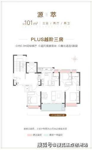 经典飞机户型+三开间朝南+餐客厨一体化+ 约5.3m的阔绰横厅, 整体南向面宽达到约11.5m!整个户型的通透度和采光度很棒。