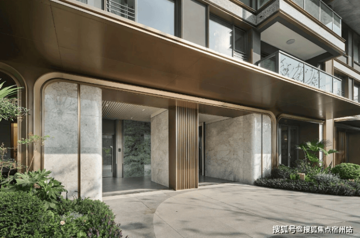 整座大堂外墙 采用伯爵灰大理石满铺高墙 ,电动门镶嵌 宝格绿奢石 ,实现无感通行;