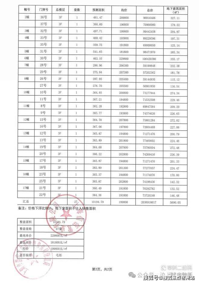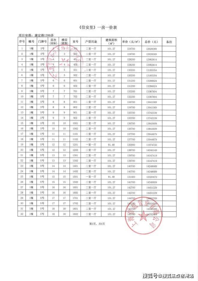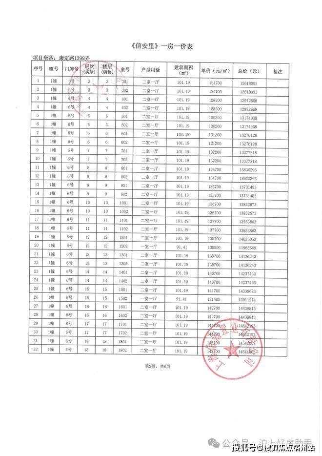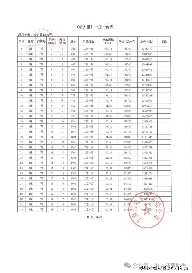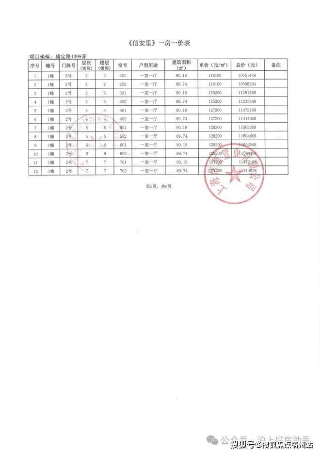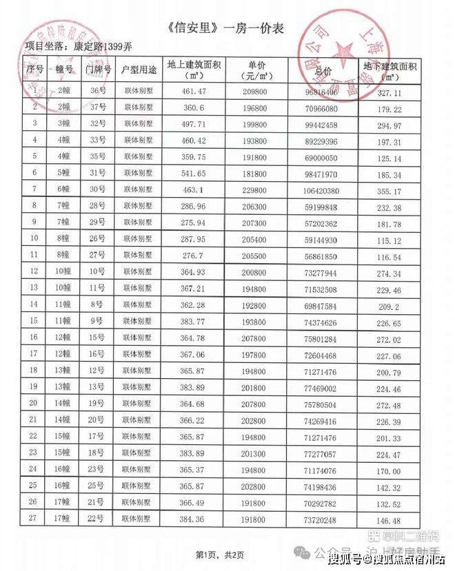 信达·信安里高层/别墅一房一价表如下: