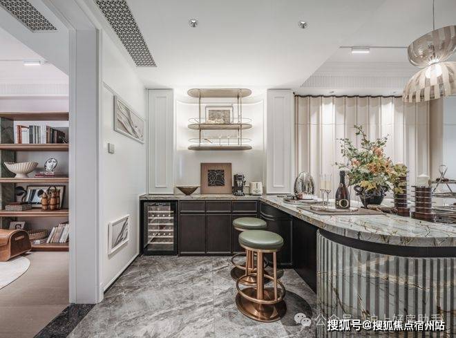 更好更奢的归家门庭,嘉佩乐酒店风格,海派元素充满空间的每一个角落,地面的复古花纹,金属镂空装饰墙,普拉达绿的奢石点缀,仿佛穿越到了摩登时代。