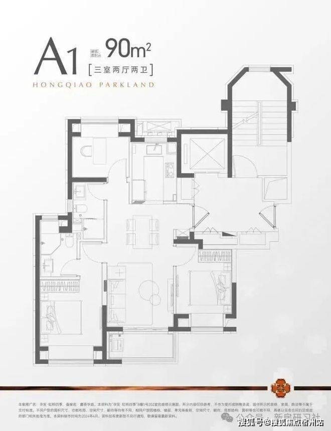 建面约90m²三房两卫户型同样是飞机户型,华发虹桥四季售楼处电话☎:400-8266-670✅✅南北通透,全明户型,空间利用率极高!