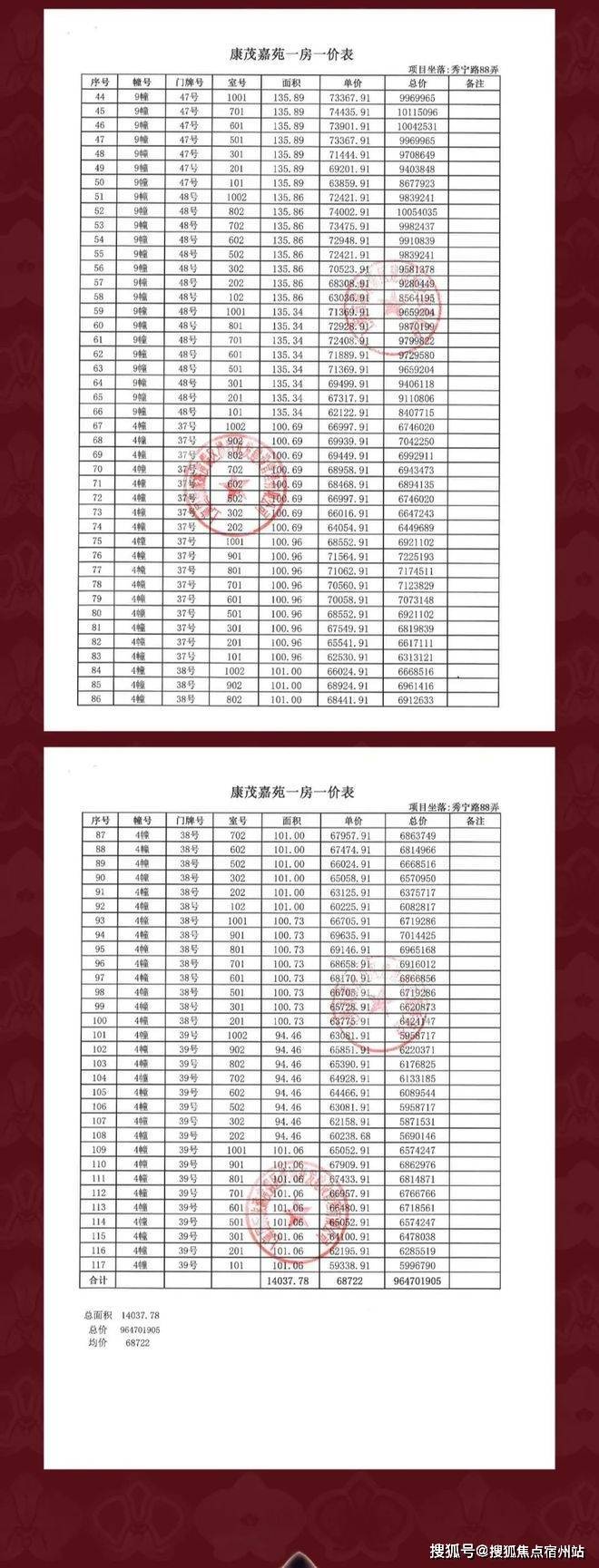 一房一价表: