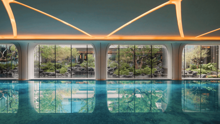 约500㎡艺术馆般泳池, 天花、墙面以现代摩登的手法,抽取上海海派建筑造型为元素,打造充满静奢韵律的造型,搭配泳道尽端 景泰蓝奢石背景墙,勾勒出一处臻享静美的精神之所。