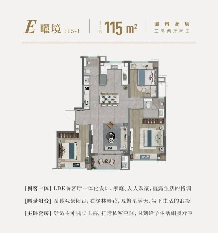 约115㎡3房2厅2卫,典型的“飞机户型”,同样餐客厅一体化,更宽敞的空间感;U型厨房,切配更流畅;卧室全飘窗,延展室内空间的同时,功能性更强;主卧套房设计,更私密、更舒适。
