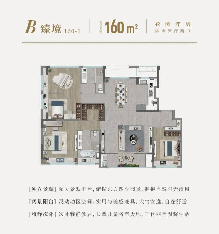 约160平方米的大宅,同样4开间朝南,更奢阔的空间,更自由的生活。动静分离,主卧更有步入式衣帽间,女主人的梦想都在这舒适的空间中一一实现,三卧朝南,北房间自由灵动,一间音乐室,或是图书室,也可以是书房、观影房……总之随心所欲。