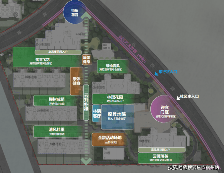 五维 是景 观的层次 :从社区主入口的酒店式落客区开始,到摩登水院、核心水院会客厅、林隅客厅、全龄活动场地、街角花园……它不是一条直路,而是一层一层递进的景观序列。