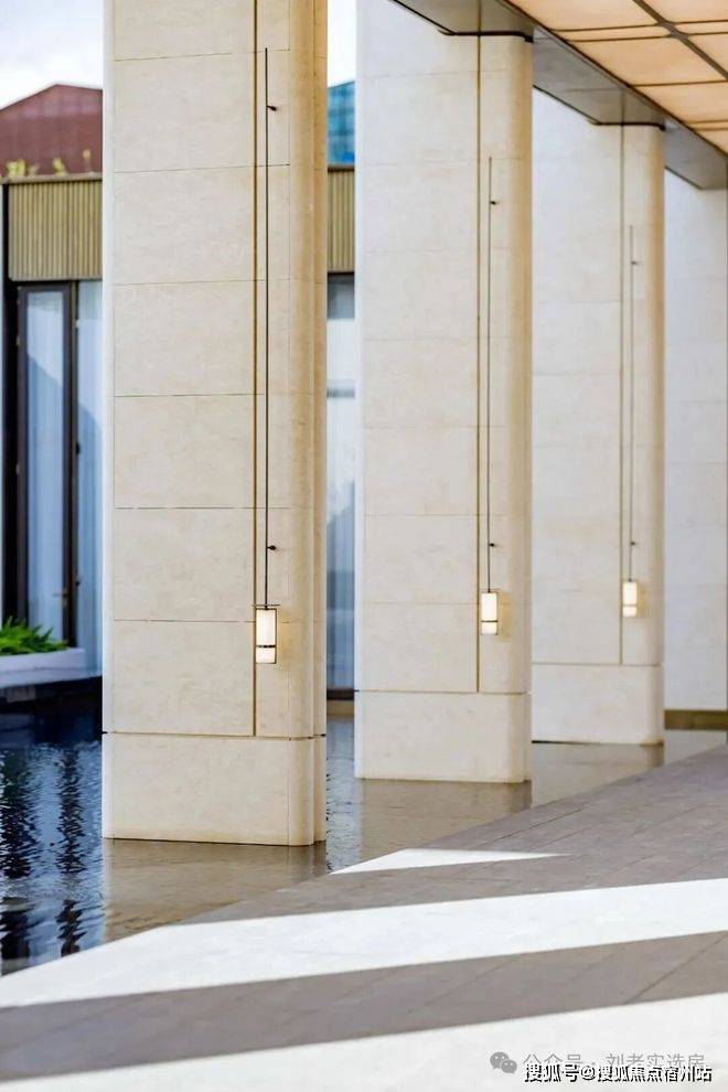 顶部定制发光云石亚克力与圆弧形的古铜色铝板交相辉映,✅✅招商序售楼处电话:400 - 882 - 4258✅✅8个西班牙宫殿沉香米黄石柱提升了尊崇感,漫步其间,揽风入怀,树影斑驳映入眼帘,水声潺潺入耳,归家的轻松感油然而生,笔者随手一拍,都非常的出圈。