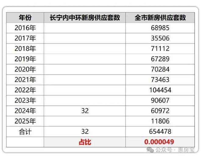 据网上房地产数据显示,近10年(2016年至今)全上海合计入市新房65万多套,其中属于长宁内中环的只有32套,占比仅约0.000049!