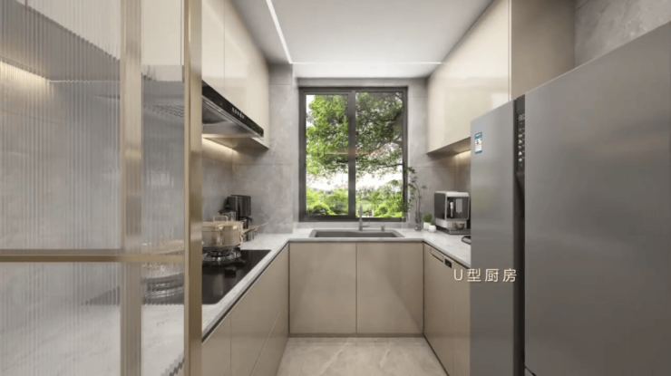 厨房U型操作台面,操作空间充裕;更值得点赞的是预留了双开门冰箱位置,你要知道普通百平米三房,基本只预留单体冰箱的空间。
