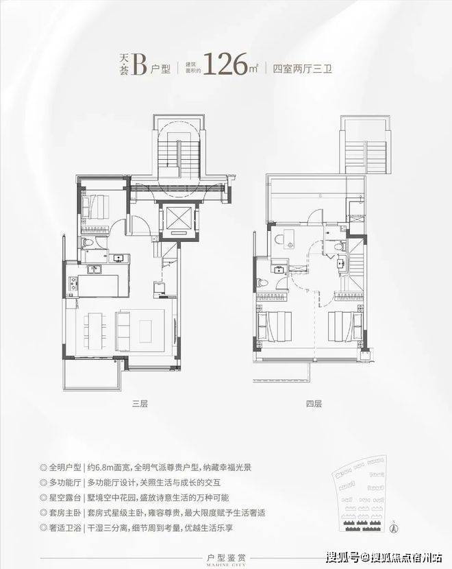 而中叠(建面约123㎡)则集便利与尺度于一身:不仅配备独立电梯厅,更以约13.4米南向面宽、约6米宽厅及南北双270°转角飘窗,营造出宽幕视野与通透空间,体感媲美整层大平层,实得率几近“满格”。